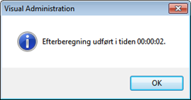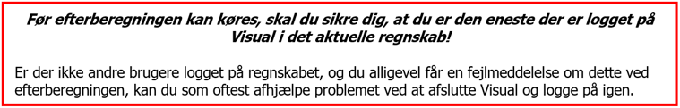 Vær opmærksom på at efterberegningen kan tage op til flere minutter, alt efter hvor mange posteringer der ligger i de enkelte moduler. Når efterberegningen er foretaget kommer nedenstående skærmbillede.