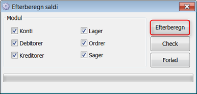 Funktionen anvendes til at efterberegne saldi og beholdninger i de enkelte moduler, i forbindelse med årsafslutningen, eller hvis der er opstået difference mellem en kontos totalsaldo og tilhørende posteringer.