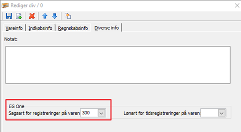 I fanen Diverse info sættes en sagsart på de varer, der skal kunne registreres på.
