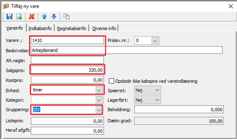 Dernæst skal du oprette en tilhørende vare. Det er via varenummeret, der synkroniseres til EG Go og det er også på varen, du indtaster evt. salgspris, hvis lønarten skal faktureres videre.