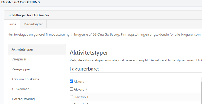Gå i Tid > EG Go Opsætning > vælg fanen Firma eller Medarbejder og vælg Aktivitetstyper.