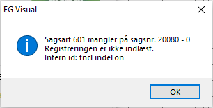 Hvis du har indlæst EG Go registreringer i en sagskladde, og du ikke har fået valgt standardsag eller sagsart på en sag, der er registreret timer til, vil du få en fejl ved indlæsning i kladden.