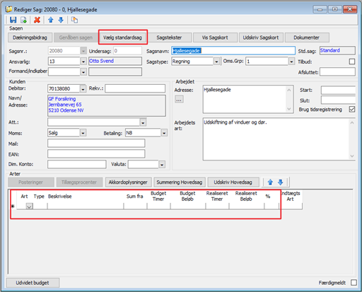 Åben den pågældende sag og vælg standardsag eller tilføj den manglende sagsart ved at skrive sagsartsnummeret på nederste linje i arter på sagen.