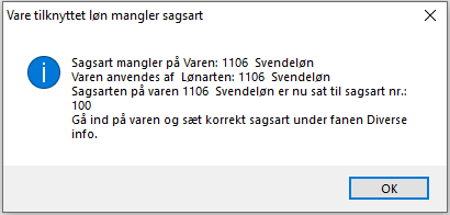 Da sagsart ikke findes på varen, sættes sagsarten til "100" på posteringen. Det skal rettes.