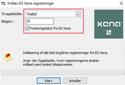 Marker feltet "Posteringstekst fra EG Xena", hvis du ønsker kommentarer indlæst på linjerne.