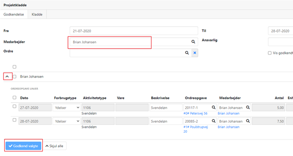 Som standard foreslås godkendelse af timer i indeværende uge, men du kan rette datoen. Det er muligt at afgrænse pr. medarbejder, hvis der er mange registreringer.