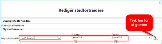 Vælg den godkender, som skal have en stedfortræder indsat. Sæt stedfortræder på, samt vælg Start- og Slutdato. Tryk til sidst på ikonet ude til højre for at gemme:
