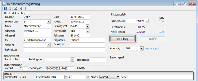 Først når InfoFlow Status er "Godkendt", kan fakturaen klargøres til bogføring og/eller bogføres.
