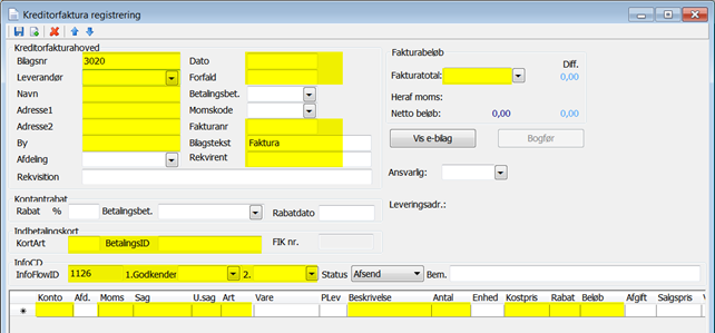 De gule felter herover udlæses til InfoFlow og er derfor låst for rettelse, hvis InfoFlowStatus er "Sendt".