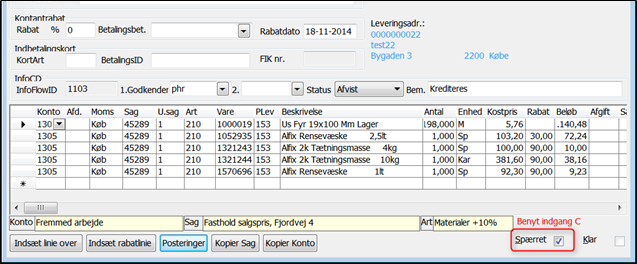 OBS: Hvis der er flueben i feltet "spærret" nederst, kan det betyde at fakturaen ikke er registreret manuelt, men er indlæst elektronisk f.eks. som EDI eller OIO faktura. Er fakturaen spærret, kan fakturalinjer ikke slettes, der kan kun rettes i kolonnerne Konto, Afd., Moms, Sag, U.sag og Art. Før du frit kan rette i fakturaen skal dette flueben først fjernes. Du kan evt. benytte genvejstasten <Alt-S> til dette.