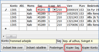 Hvis der mangler sagsnr. på linjerne, eller hvis indlæst sagsnr. er forkert, indtastes korrekt sagsnr. samt Art på den første linje. Derefter kan du automatisk få ændret sagsnr./art på de øvrige linjer ved at klikke på knappen "Kopier sag" nederst: