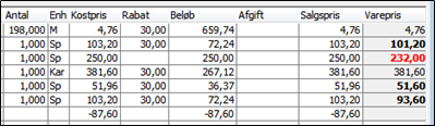 - Hvis Varepris er med fed skrift betyder det, at den fakturerede bruttopris (før evt. rabatter) er højere end prisen i varekartoteket, men samtidig er nettoprisen (efter evt. rabatter), lavere end prisen i varekartoteket.