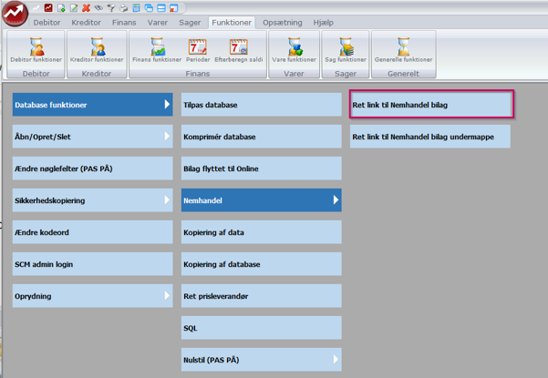 Gå i Funktioner -> Generelle funktioner og Ret link til Nemhandel bilag