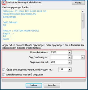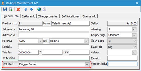 Finans købskonto, Sagsart samt prisleverandør kan også påføres selve kreditoren. Dette kan med fordel anvendes, hvis man benytter bundtvis indlæsning. Hvis ikke felterne er udfyldt på kreditoren, benyttes de valgte oplysninger i indlæsningsskærmbilledet.