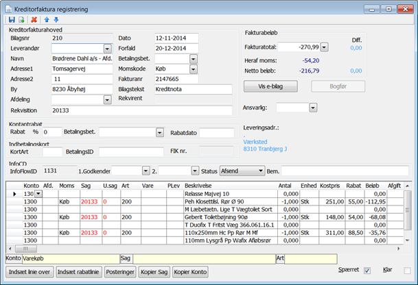 Kreditorfakturaerne behandles herefter som almindelige kreditorfakturaer under Kreditorer -> Købsfakturaer (klassisk menu: Funktioner -> Kreditorer -> Faktura registrering).