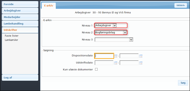 Vælg Udskrifter -> Arbejdsgiver -> Bogføringsbilag og klik på knappen "Søg":