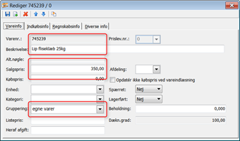 Under fanebladet Vareinfo indtastes Varenr., beskrivelse m.m. Som minimum skal indtastes "Varenr.", samt der skal vælges  "Gruppering". Disse oprettes under Opsætning -> Vare opsætninger -> Varegrupper (klassisk menu: Opsætning –> Integration –> Varegrupper).