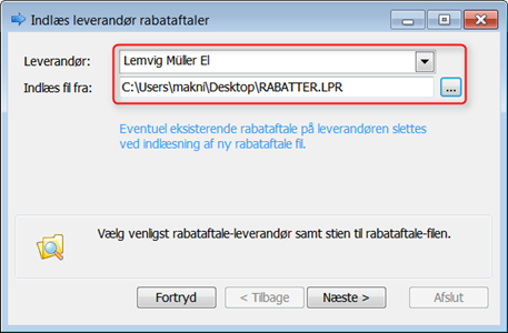 I feltet "Indlæs fil fra", udpeges den rabatfil du har modtaget fra leverandøren. Du kan trykke på boksen ud for feltet for at finde filen.