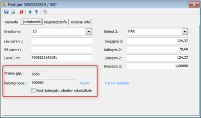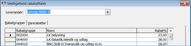 Rabatgruppe med rabatprocent og gruppenavn = Varens Rabatgruppe hos leverandøren (3+3 cifre = varetype hoved- og undergruppe, indlæst fra leverandørens prisfil). Rabatprocent og gruppenavn, er hentet fra rabataftale gældende for denne vare.