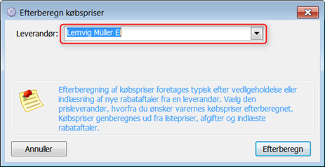Vælg Leverandør og klik på knappen "Efterberegn".