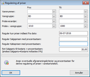 Reguler kun priser indlæst fra dato: Indtastes en dato i dette felt, vil KUN varer der er indlæst på den pågældende dato blive justeret, stadig med hensyntagen til de øvrige afgrænsninger. Systemet foreslår altid dags dato.