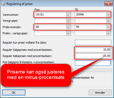 - Reguler købsprisen med procentsatsen: Indtastes en procent her, vil nuværende kostpriser blive forhøjet/formindsket med den indtastede procentsats. Har du f.eks. en vare med kostpris på kr. 100,00, og der her indtastes -10%, vil ny kostpris blive beregnet til kr. 90,00. Salgsprisen vil IKKE berøres.