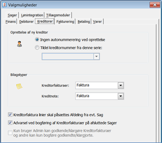 Advarsel ved bogføring af kreditorfakturaer på afsluttede sager: Markeres dette felt, vil du få en advarsel hvis du vælger en afsluttet sag. Du vil her blive spurgt om du vil genåbne sagen, eller om du vil fortsætte med bogføring på den afsluttede sag.