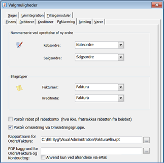 Poster rabat på rabatkonto…: Markeres dette felt, vil evt. rabat på debitorfakturaer blive bogført på en særskilt rabatkonto. I modsat fald fratrækkes rabatten på omsætningskontoen.