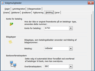 Bankoverførselssystem: Her vælges hvilket bankoverførsels system, din bank benytter, for korrekt dannelse af betalingsfil. Er du i tvivl kan du spørge din bank til råds.