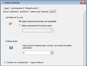 Oprettelse af ny vare: I øverste del vælges, om systemet ved oprettelse af en ny vare skal foreslå varenr. Hvis denne markering vælges, skal man efterfølgende vælge en nummerserie. Se minivejledning O10 for oprettelse af disse. Markeres feltet Ingen autonummerering ved oprettelse, kan du selv bestemme varenr.