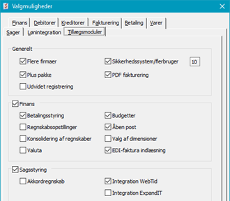 Under Valgmuligheder findes en række standard opsætninger, som har indflydelse på funktionerne i de forskellige moduler. Skærmbillederne findes under Opsætning -> Valgmuligheder (klassisk menu: Opsætning -> Valgmuligheder):