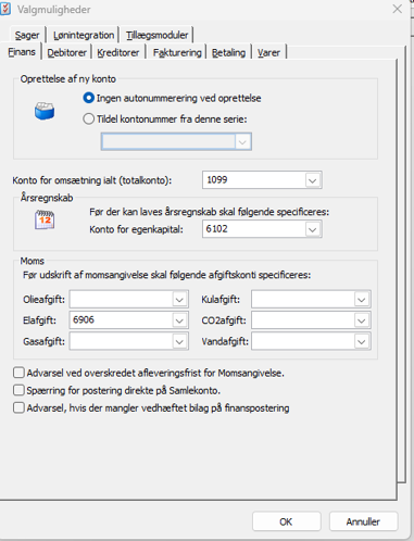 Moms: Her vælges dine afgiftkonti. Disse benyttes ved udskrivning af momsangivelsen.