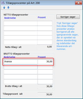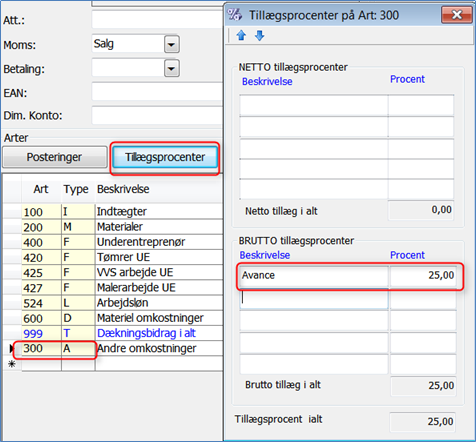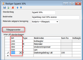 På alle arter med typen M (materialer), F (fremmed arbejde), A (andet) samt D (diverse) indtastes en Brutto tillægsprocent. Denne sats benyttes til beregning af salgsprisen på de pågældende arter.