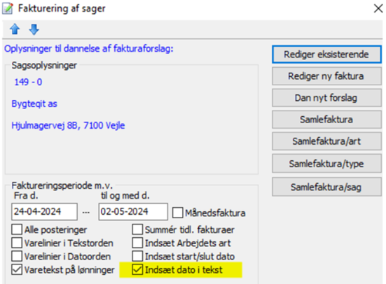 Obs! automatisk faktura tillæg kan ikke kombineres med, at man har flueben i Indsæt dato i tekst