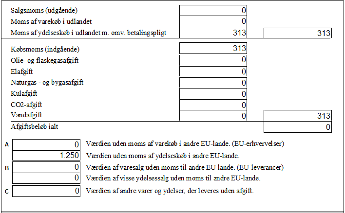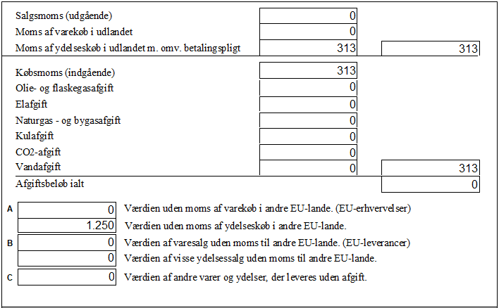 Værdien af momsen vises i feltet "Moms af ydelseskøb i udlandet" samt modposteres på købsmomsen.