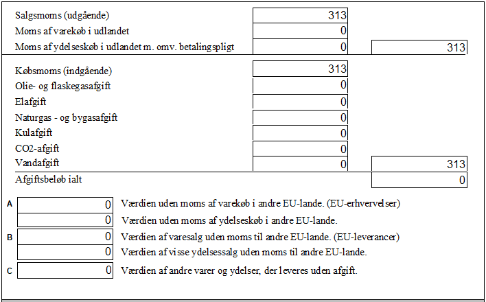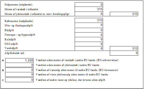 Værdien af momsen vises i feltet "Moms af varekøb i udlandet" samt modposteres på købsmomsen.