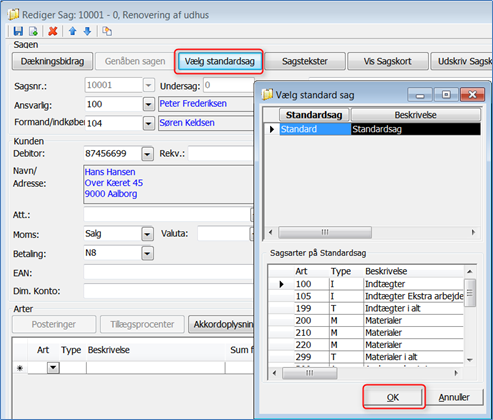 Nu vises oversigten over din/dine standardsager. Stå på den der ønskes benyttet på den aktuelle sag, og klik på knappen <OK> nederst.