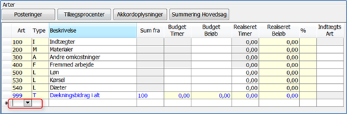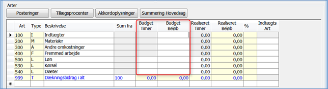 Ud for sagsarter af typen M, A, D, F og L indtastes budgetterede omkostninger – her indtastes beløb med minus foran.