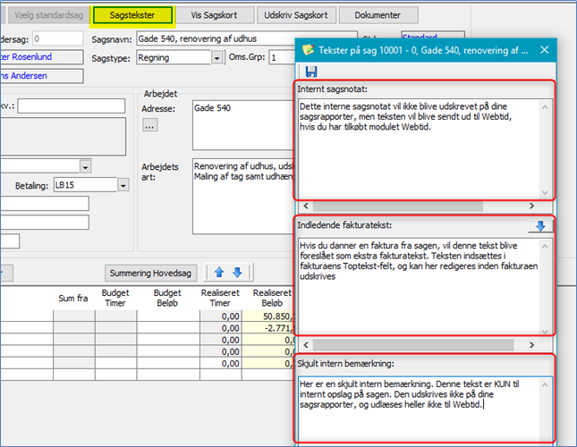 Under knappen Sagstekster kan du indtaste 3 forskellige slags ekstra tekster: