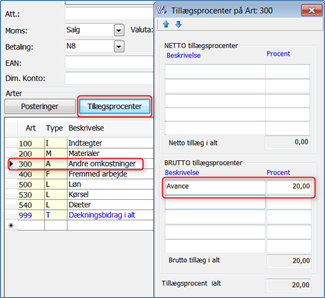 Brutto tillægsprocent anvendes på sagsarter af typen M, A, D og F. Brutto tillægsprocent anvendes til beregning af salgspriser.