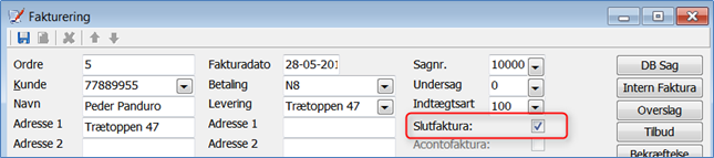 Endeligt kan du afslutte en sag, ved på en faktura til sagen at markere feltet "Slutfaktura". Feltet findes øverst til højre på faktura skærmbilledet: