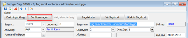 Dobbeltklik på den sag der ønskes genåbnet, og klik her på knappen øverst "Genåben Sagen". Denne knap vil kun være aktiv på afsluttede sager.