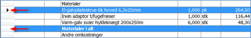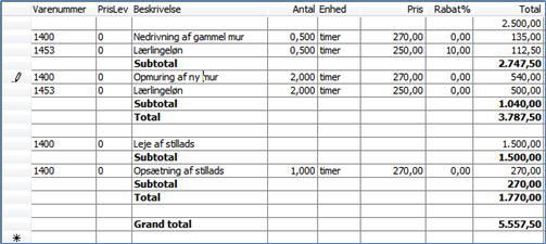 1. Indsæt total: Ved tryk på knappen indsættes en total-linje hvor markøren er placeret. Der er mulighed for at indsætte totaler i 3 niveauer: Subtotal, Total samt Grand Total. Beskrivelsen ud for de enkelte total-linjer kan frit redigeres: