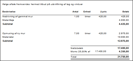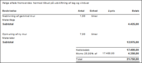 Du skal vælge om du ønsker specificerede priser. Svares "Ja" vil tilbudslinjerne udskrives som du ser dem på skærmen. Svares "Nej" vil kun teksten samt antal/enhed udskrives fra detaillinjerne, kun totallinjerne indeholder beløb (se eksempel på begge typer nedenfor).