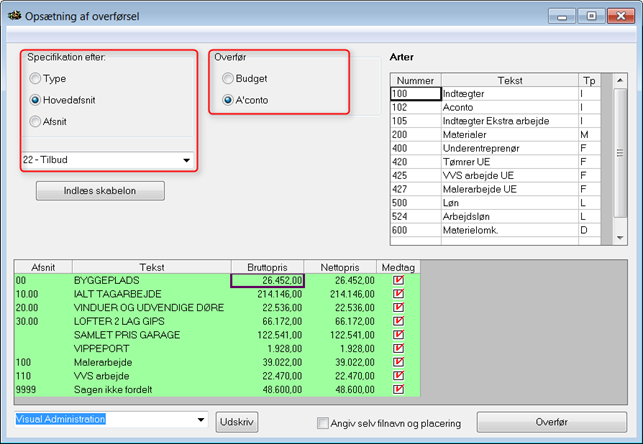 Det er muligt at få overført kalkulationens afsnitslinjer til aconto grundlag i Visual.