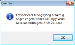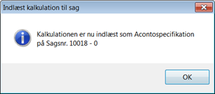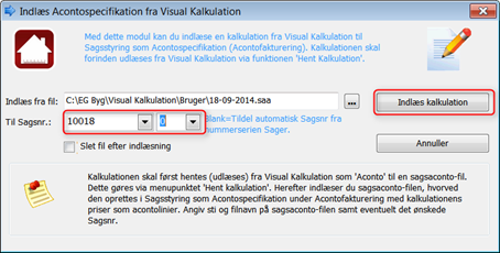Systemet finder selv den sidst udlæste kalkulation. Hvis sagen på forhånd er oprettet i Visual, skal du vælge Sagsnr / undersagsnr. Klik på knappen "Indlæs kalkulation" for at starte indlæsningen.