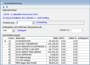 Eksempel på indlæst aconto grundlag fra en kalkulation: