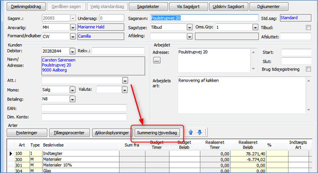 For at få vist denne summering skal du åbne hovedsagen. Tryk på knappen "Summering hovedsag" eller benyt genvejstasten <Alt+H>: