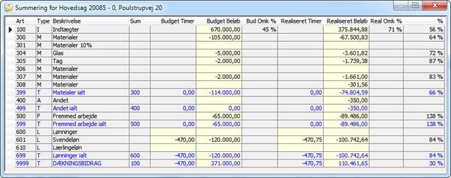 Har du oprettet undersager til en hovedsag, kan du via hovedsagen få overblik over samlede indtægter/omkostninger fordelt på alle arter. Derudover vises også samlet budget, samt procentvis forskel.