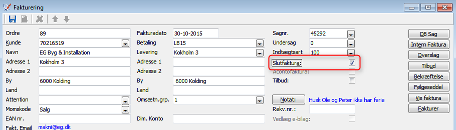 Når en sag skal faktureres og man danner fakturaforslag, vil der automatisk blive sat flueben i Slutfaktura, hvis dette er angivet på sagstypen. Slutfaktura betyder, at sagen automatisk afsluttes, når fakturaen bogføres.